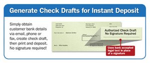 Simply obtain customer bank details via email, phone or fax, create check draft then print and deposit. No signature required!