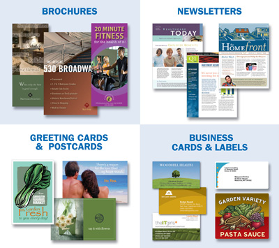 - Brochures, letterhead, newsletters, post cards, greeting cards, labels, envelopes, and more