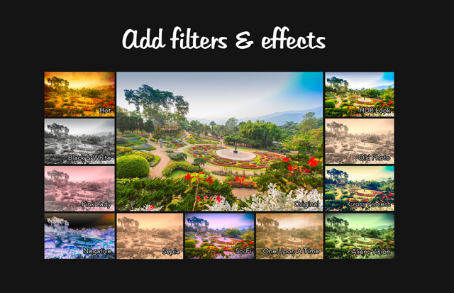 - Add filters & photo effects: warm, black & white, pink lady, negative, sepia, science fiction, vintage