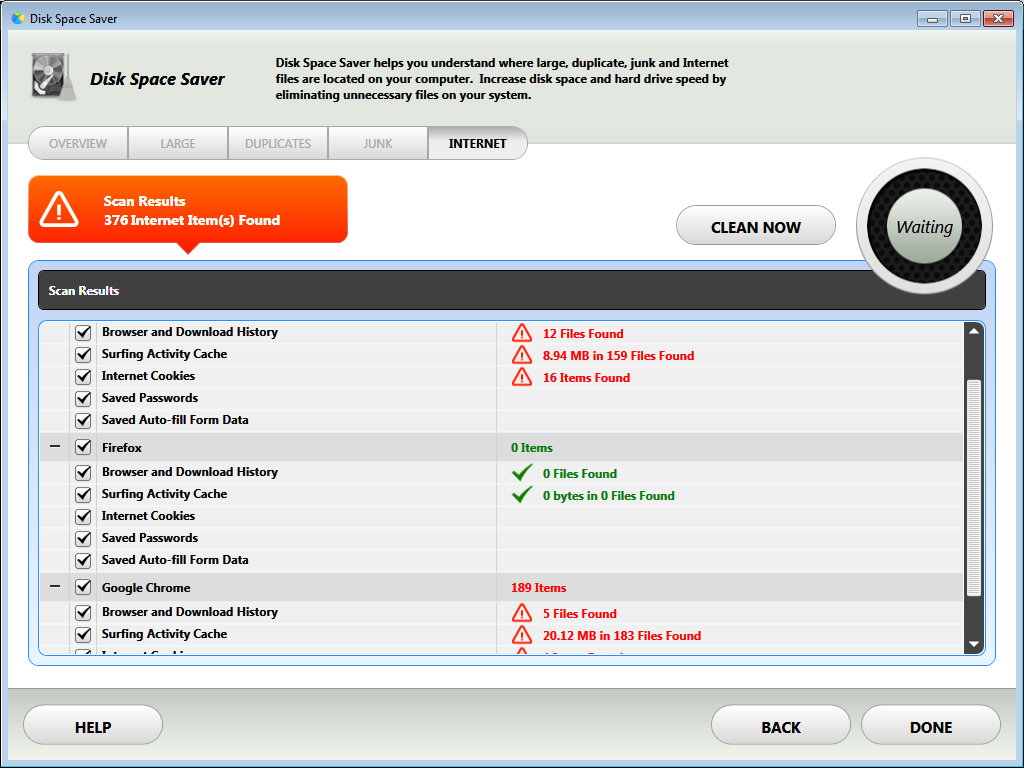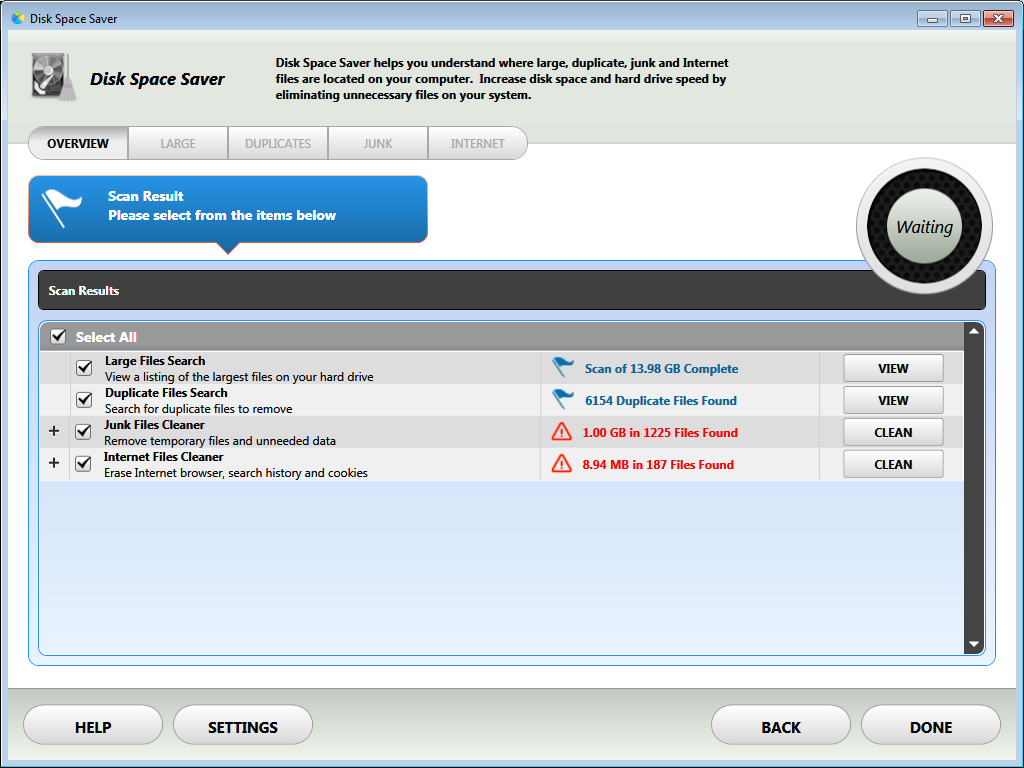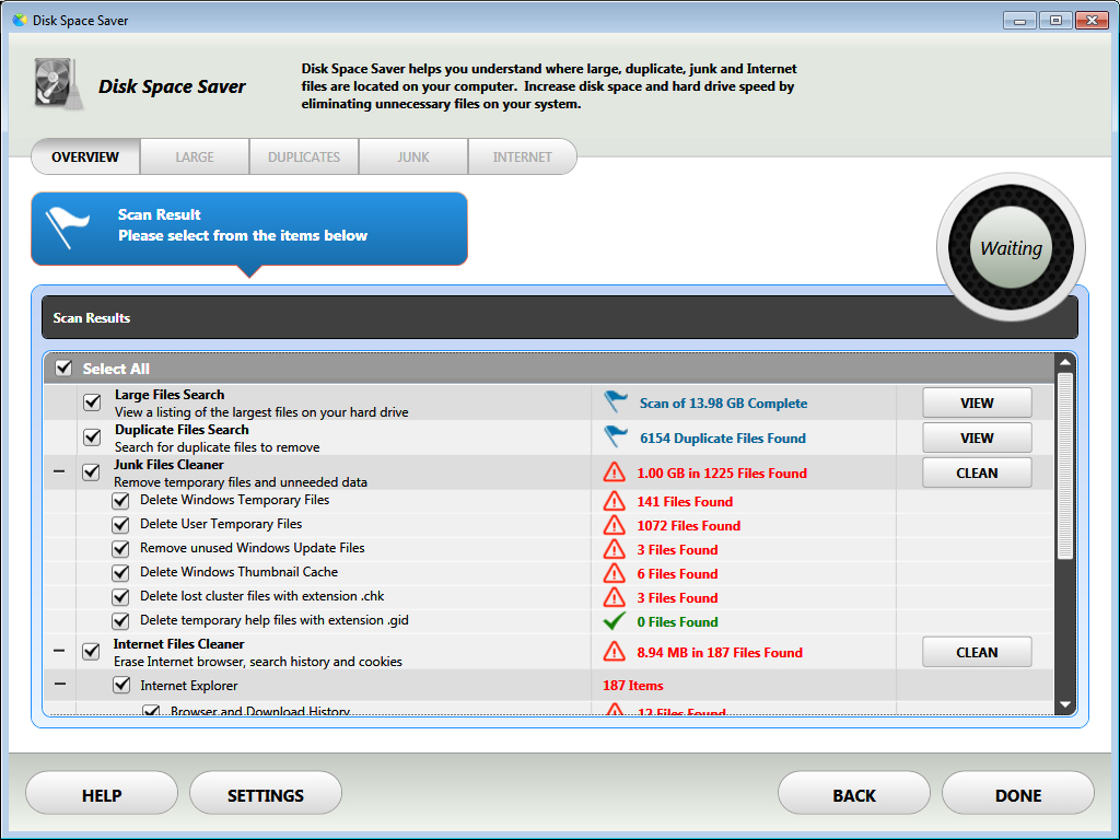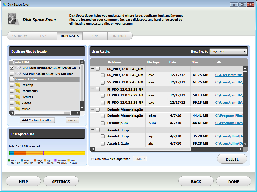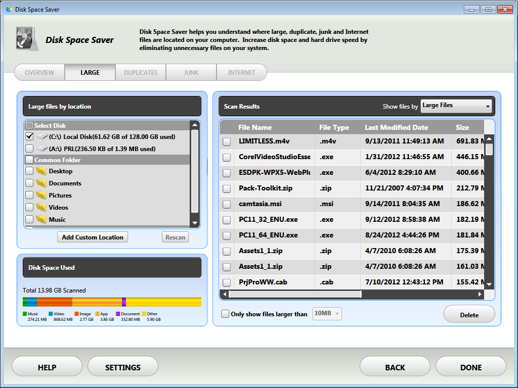Disk Space Saver scans and identifies where all your large, duplicate, junk and Internet files are located.