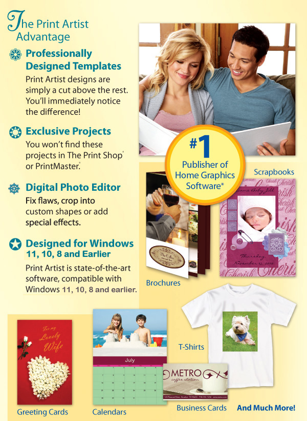 Print Artist® Platinum 25 is unlike any print software you’ve ever used - its unparalleled quality combined with unprecedented ease of use lets you produce amazing print projects for your home, school or business.