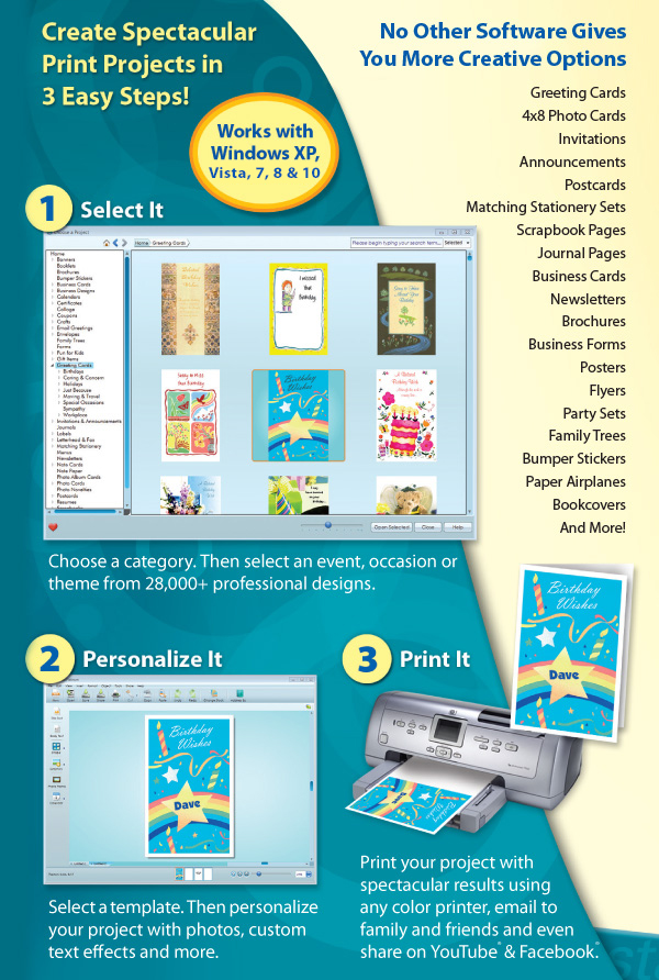 Impress friends, family and clients with the creative edge that only Print Artist Platinum can offer – 28,000+ professionally-designed templates, 377,000+ sensational graphics, 1,000+ premium fonts and more! With its powerful, yet easy-to-use design, text and drawing customization tools, advanced photo editor, special text effects gallery and more, you’ll be creating expert, eye-popping print projects with a professional, custom look that truly raises the bar!